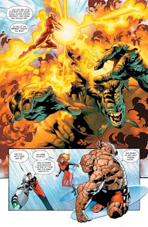 Der Sonderband beginnt Action geladen mit einem Kampf der von Krisen gebeutelten Fantastic Four gegen einen wutschnaufenden, manischen Fin Fang Foom. Ein typischer Superhelden-Alltag.