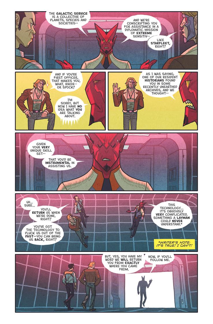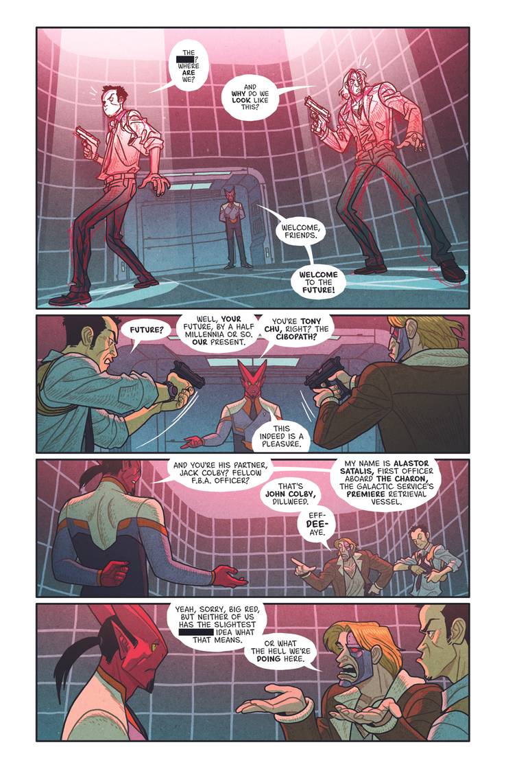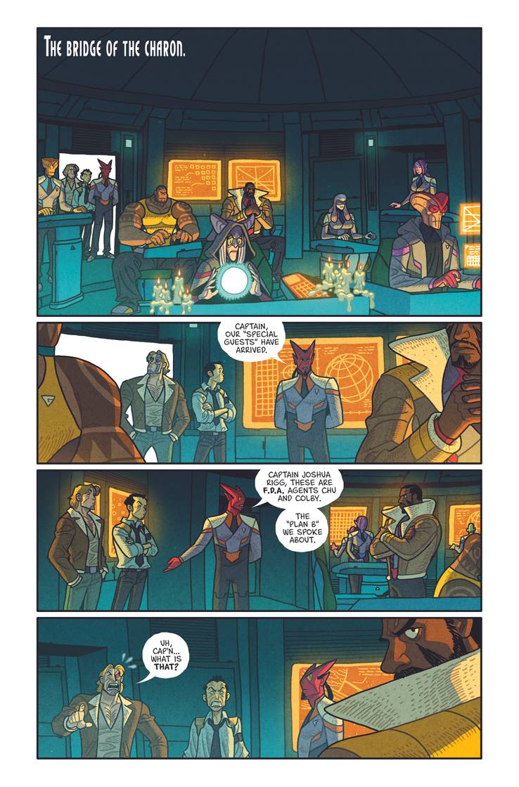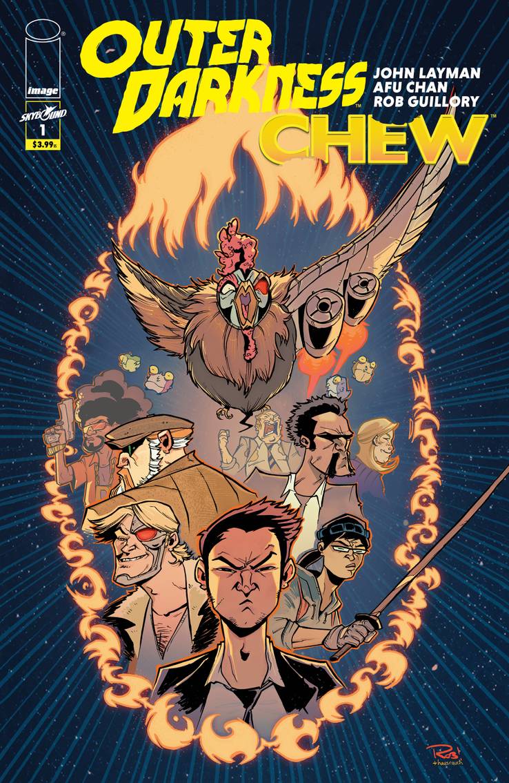 THE GREATEST CROSSOVER EVER! Tony Chu is a modern-day cop who gets psychic impressions from what he eats. Joshua Rigg is a 28th Century starship captain flying through an outer space filled with demons, monsters and ghosts. Sounds like a perfect recipe for a comic book crossover, don’t it? Well, be careful what you wish for, because CHEW/OUTER DARKNESS is warping your way, reuniting the multiple Eisner-winning CHEW team of writer John Layman with artist Rob Guillory, alongside OUTER DARKNESS’ regular resident artistic genius, Afu Chan!